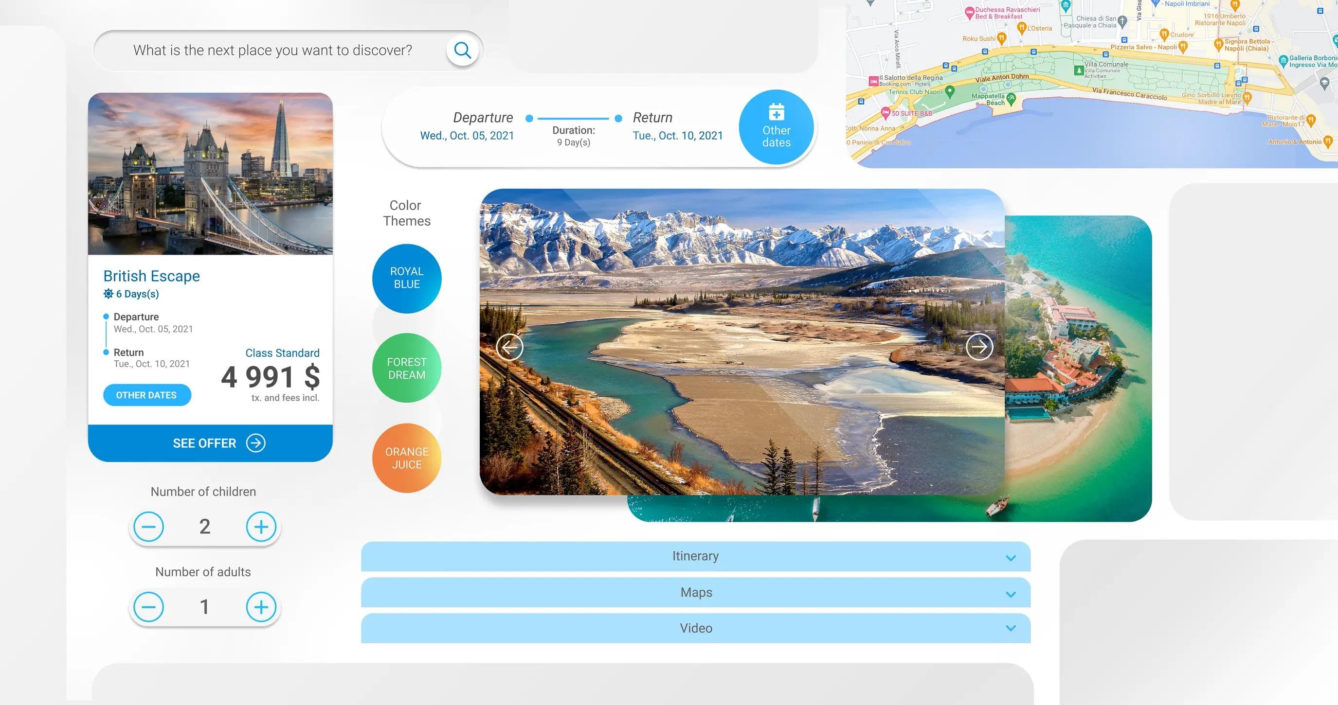 Tour Online a une interface rapide, moderne et réactive qui s'adapte aux différentes tailles d'écran. 3 thèmes d'interface sont disponibles et l'utilisateur peut créer différents groupes pour chacun de ses produits de voyage. D'autres fonctionnalités sont disponibles comme l'ajout de cartes, de vidéos et de documents.
